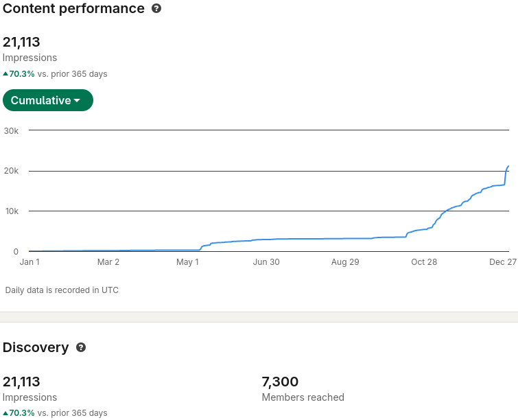 I feel happy about these LinkedIn results, with my 21,000 impressions (+70.3% compared with last year) and 7,300 members reached. It will be fun to see what my statistics will be at the end of 2026.